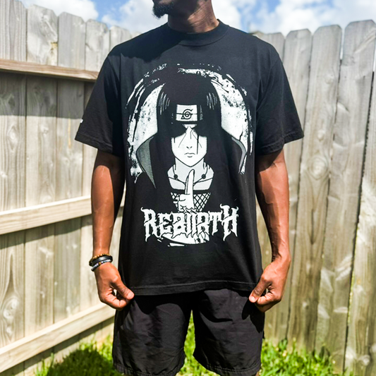 This heavyweight oversized tee features a distressed monochrome portrait of Itachi Uchiha — channeling the calm chaos of a true shinobi.